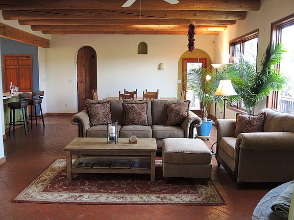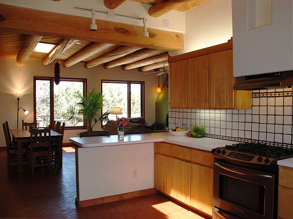 On June 13th a new ($14,000) air conditioning/heating system will be installed throughout the house and in addition, two new exterior pumps for the water cisterns. Hidden in the Islands of Eldorado located next to a 62-acre greenbelt sits a 2671 sq ft home - you can't get more private and quiet! Homes here are offset from one another, and there are lots of trees. This property feels more like an estate rather than just a house. A large deck runs nearly the entire length along the back of the house with a hot tub for star viewing. The hot tub is top quality, in excellent condition and included in the sale. All three bedrooms are lovely, with one as a studio bedroom (which could be a studio) - a gorgeous 800 sq ft room with high ceilings, vigas, American clay walls, beautiful (expensive) tiles from Italy, a double-sided fireplace with handmade glass and metal doors. Pella architectural grade windows and stunning custom-made arched wooden doors (built in 2006). A magnificent laundry/ storage room with custom designed alder wood cabinets and maple countertops. There's a grey-water system in the laundry that can send your biodegradable water outside for tree watering. At the other end of the house is another bedroom with a private bathroom and walk-in closet. The third bedroom is sweet and cozy, also with American Clay walls. A lovely open style living/kitchen/ dining room with vigas, arched doorways, and brick floors. A detached garage, (built 2006, $85k) fully insulated.