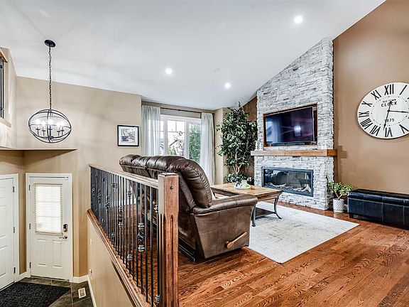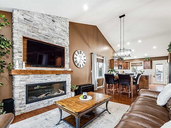South-facing pie lotVaulted ceilingsStunning floor-to-ceiling stone mantelNew electric fireplaceHardwood flooringNewer granite countersMain floor laundry