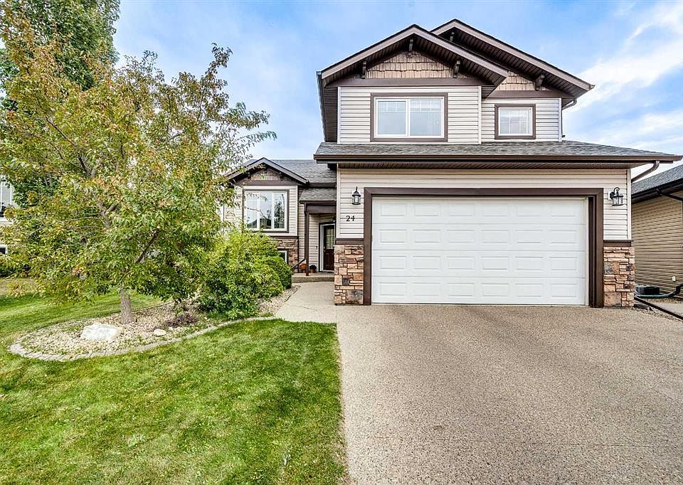 Welcome to 24 Illingworth Close! This 1,656 sq. ft. modified bi-level with a walkout basement sits on a large south-facing pie lot in one of the best locations in Inglewood, close to the new Don Campbell Elementary School, East Hill Shopping Centre, parks, and walking trails. The bright main level showcases vaulted ceilings, a stunning floor-to-ceiling stone mantel with new electric fireplace, and hardwood flooring throughout most of the main level, Kitchen is complete with newer granite counters and a beautiful feature wall desk area. Step out from the kitchen to your top deck and enjoy beautiful mountain views while overlooking the spacious backyard. Convenient main floor laundry and two additional bedrooms complete the main level, while the private upper-level primary retreat offers a walk-in closet and a 4-piece ensuite with soaker tub, tiled flooring, and a separate shower. The walkout basement boasts large windows overlooking the backyard, two spacious bedrooms (one ideal as an office or theatre room), and comfort features like in-floor hot water heating and a central air exchange system. The oversized backyard is equipped with underground sprinklers and plenty of room to play, garden, or entertain. Updates include new shingles which have been just installed. A perfect family home in a prime Inglewood location with amenities and lifestyle at your doorstep!