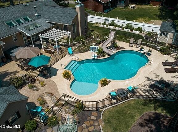 Imagine entertaining friends and family at your resort-style home! This dream haven boasts amenities, comfort, luxury, and relaxation. Step inside to a cozy great room with a gas fireplace, perfect for gatherings. The master suite, a tranquil retreat, also features a gas fireplace. The gourmet kitchen, equipped with high-end appliances, is a chef's dream. The finished basement offers a gym, playroom, and ample storage. The backyard is an oasis with a heated saltwater pool, slide, diving board, and 8-person hot tub. Enjoy evenings by the dual firepits or relax in the hammock on your private sandy beach. The pool house with a half bath adds convenience. Embrace a lifestyle of comfort and luxury in this stunning residence and create lifelong memories! owner is a licensed NYS Broker.