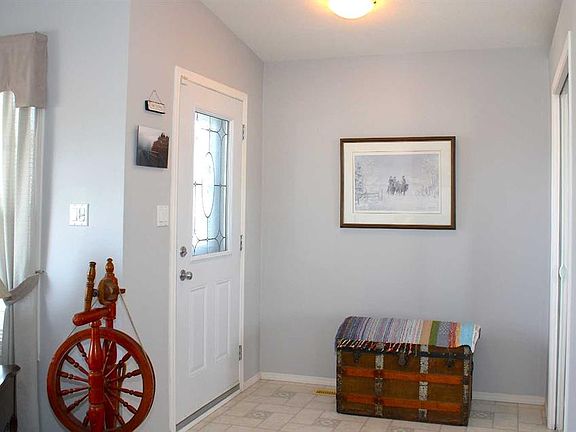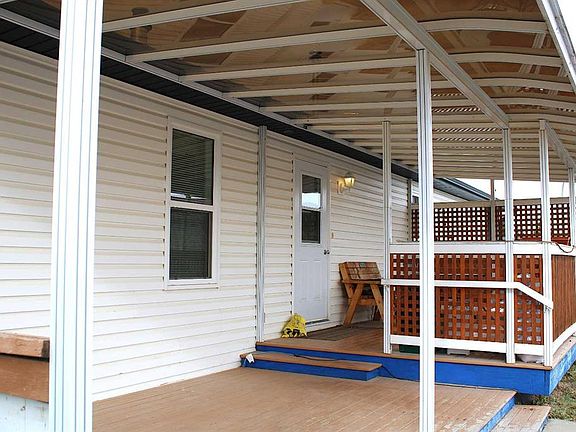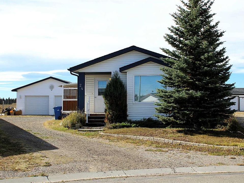 Located in a quiet, family-friendly neighbourhood, this property provides easy access to nearby walking trails, schools, shops, and restaurants. Residents benefit from the peaceful setting while remaining close to all of Sundre's key amenities. Noblefern Way is designated for modern modular residences situated on town-sized titled lots, free from condominium or strata fees. Lot #24 offers a spacious, pie-shaped configuration with views of the western green space and the added benefit of no neighbouring properties to the rear. The 20-foot-wide, 2-bed, 2-bath drywalled modular home offers the comfort and appearance of a traditional bungalow. One of its best features is the closeted foyer. Here is room to take off your shoes and hang your coat without cluttering the main living area, keeping the entrance organized and welcoming for both guests and residents. The vaulted ceilings add spaciousness, and the large windows bring in natural light. Double skylights in the kitchen brighten the heart of the home, creating an airy, light-filled space perfect for family meals or entertaining friends. A central island provides extra storage space and seating. There is an abundance of crisp white upper and lower cabinetry and counterspace. A huge corner pantry is essential, ensuring that groceries and kitchen essentials are easily accessible and neatly organized. The kitchen is designed to keep family life running smoothly. Modern finishes and thoughtful touches throughout ensure everyday comfort, while ample storage makes this house both practical and stylish. The great layout continues beyond the kitchen and living areas, seamlessly integrating functionality with comfort throughout the home. Adjacent to the main spaces, the rear entry’s stackable laundry and generous storage solutions make household chores efficient and organized. Across the hall is a convenient four-piece bathroom, brightened by a skylight. The second bedroom works perfectly as a flexible space for guests, a home office, or a fitness area, blending with your lifestyle needs. Located at the far end, the primary suite offers a refined living space with an expansive walk-in closet, a dedicated computer workspace, and storage solutions to maintain organization. The ensuite bathroom includes a corner jetted tub and an ample counter area featuring dual sinks. The southwest-facing covered deck and spacious ground-level deck that stretches 32 ft extends the living space outdoors, providing the ideal setting for relaxing in the fresh air. A detached double-car garage provides ample secure parking and additional storage space for your vehicles, outdoor gear, and tools. Easily accessible from the backyard, this versatile structure enhances daily convenience and supports an active lifestyle, whether you need room for hobbies, gardening supplies, or space for a workshop. Its placement complements the overall property, rounding out the home’s appeal with practical outdoor features that make living here AWESOME !!