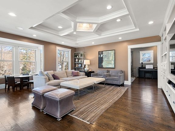 Welcome to a magnificent residence in Merriam Hill,a masterpiece of modern living,newer custom-built home that epitomizes elegance &luxurious space w/an expansive lot & privacy. Front entry porch invites you to a sophisticated formal foyer & living room,an expansive open layout grand kitchen w/Thermador Appliances that flows into a breakfast area & family room w/vaulted ceilings,all offering picturesque views of a beautifully landscaped backyard. Exquisite coffered ceilings in the family,dining room. Fine moldings,fireplace & custom built-ins,exemplify the home's elegance. The 1st-floor office w/a full bath can serve as a nanny/in-law suite. The 2nd floor houses a stunning primary suite w/vaulted ceilings, a cozy fireplace & custom his-and-hers closets,w/ 5 spacious bedrooms & 3 ensuite bathrooms. The lower level is a haven for entertainment & wellness,features a gym,family room,full bathroom & a furnished media room. Includes a circular driveway,an attached 2-car garage.