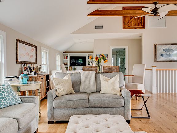 64 acres of manicured lawn. The open concept living space is located on the second floor of the home as to take advantage of the vaulted ceilings with exposed beams and sweeping views of the club's 18th hole from the deck. The decor is refined yet comfortable with plenty of plush, upholstered seating. The living room includes two sofas, set in front of a wood burning fireplace and flat-screen TV. A nearby alcove has been designed to entertain your younger guests with an additional sofa, beanbag chair, dart board, and built-in shelving that houses books and a flat-screen TV. Separating these two spaces is an informal dining room with seating for six and a bar cart. The gourmet kitchen overlooks each of these areas and is bright and fresh with white shaker-style cabinetry with white stone counters and subway tile backsplash. A stainless-steel appliance suite with gas range, microwave drawer, and wine fridge is also included. Additional counter seating for three is found at the oversized kitchen island. On the back deck, you'll find a gas grill and additional dining space for six. The main floor master suite has lovely views of the pool and grounds and includes a king bed and a sliding door that leads to a small patio space. The large ensuite bath includes dual sinks and a glass and tile rainfall shower. Two bunk rooms, with four twin beds each, are also located on the main floor with an additional full bathroom. The fourth bedroom is located on the second floor of the home, with an ensuite bath and views of the fairway. The manicured yard features a wood play structure and leads to an impressive pool area. Multiple loungers and patio furniture surround the pool with tanning ledge and spa. A beautiful pool house has been added and includes a casual living room with a flat-screen TV and pull-out sofa, bathroom, and efficiency kitchen. Adjacent to the pool house is a full home gym with free weights, treadmill, Peloton bike, and more!This property has a max occupancy of 10Please note: Additional date ranges available upon inquiry.
