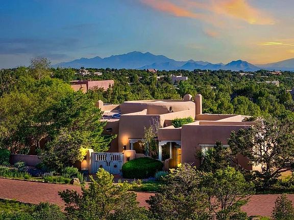 One of the most iconic homes in all of Santa Fe, this Robert Ritter-built house and guest house, exemplifies the ultimate Santa Fe and Las Campanas lifestyle with spectacular lush landscape and fountains, Jemez Mountain, Sangre de Cristo Mountain and sunset views, all within minutes to the Plaza and The Club as Las Campanas. Sited on a private, 1.8-acre lot, this distinctive home excites with a flexible floor plan which superbly incorporates a seamless indoor and outdoor living experience, while also providing excellent separation of space, featuring a 650 square foot detached guest house and an attached studio, ideal as an artist studio, home theater or large office. The main house design features include an incredible floor plan, ideal for entertaining and guests, with a stunning formal living room complete with views, a grand fireplace, portal access and a modern chandelier. The updated island kitchen impresses with leathered granite counters, Wolf and Sub-Zero appliances, a walk-in pantry and a built-in Miele coffee maker. Located directly off the kitchen is a breakfast area with a fireplace and a formal dining room, with a curved wall of windows with views of the front courtyard gardens. The spacious primary suite delights with a seating area, a fireplace, courtyard access, and a luxurious spa-like bath with access to the outdoor spa and lounging area. Additional main house features include a secondary primary suite with an ensuite bath, 2 additional guest bedrooms in the main house plus an office, and one of the finest portals in Santa Fe with a 24' wrap around outdoor living area, complete with a built-in Viking BBQ and an outdoor fireplace. The well appointed one bedroom guest house offers a separate entrance, living room, barista area, 3/4 bath and views. Exceptional features include a large 3 car garage, primarily adobe construction, a newly bricked driveway, creamy plaster walls, soft natural light and superior craftsmanship throughout.