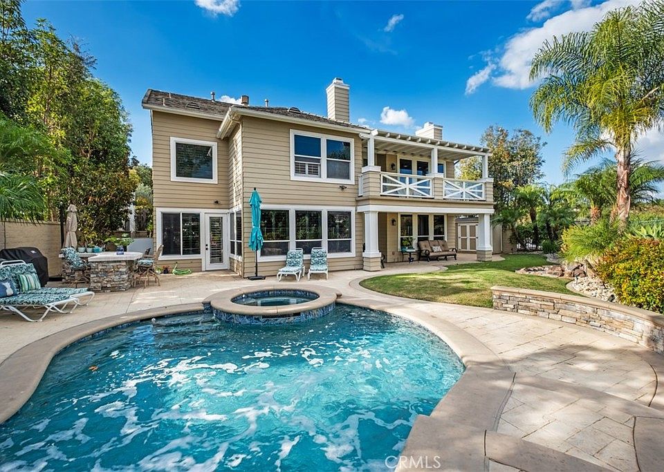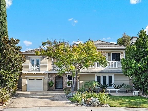Welcome to this private Cape Cod-inspired estate in guard-gated Coto de Caza, offering panoramic east-facing views and sophisticated entertaining. Nestled at the end of a cul-de-sac, this home boasts the largest floor plan in the Southern Hills Encore Tract and a truly exceptional living experience. An expansive driveway and garage provide parking for up to eight vehicles. Inside, the soaring entry reveals sweeping wrought-iron stairs and a living room with one of three fireplaces. Four sets of French doors create a seamless transition to the backyard oasis, complete with a PebbleTec pool and spa, built-in BBQ with gas line, fire pit, and a waterfall. The outdoor space includes an outdoor shower, lighting, and surround sound that extends throughout home’s main level. Four balconies provide private vantage points for the views. Throughout the home, hardwood floors, contemporary lighting, and wood shutters add functional elegance. The gourmet kitchen is open to the family room and equipped with professional-grade WOLF/SubZero appliances, dramatic slab countertops, and abundant storage including a walk-in pantry. A formal dining room is complemented by casual eat-in space and a breakfast bar. With 5 bedrooms and 5.5 baths, including a main-level in-law suite, everyone enjoys comfort and privacy. The primary suite is a true retreat, featuring a fireplace, private balcony, and a walk-in closet with custom built-ins and attic access for additional storage. An adjoining room offers flexible space for a private gym, office, or expanded closet. The spa-like primary bath includes an oversized jacuzzi tub and a walk-in shower. The upper landing provides another versatile space for a den or office. Key upgrades include recessed lighting, Casablanca fans, dual air conditioning units, a whole house fan, and a water purification system. The property also features a large, paved side yard with a storage unit matched to the home. This property offers a complete lifestyle with access to Coto de Caza's community amenities, including horse trails, a clubhouse, and sports facilities. The renowned Coto de Caza Golf & Racquet Club, with two championship courses designed by Robert Trent Jones Jr., is also nearby, and all is located within minutes of diverse shopping and dining options. This is Coto de Caza living at its best.