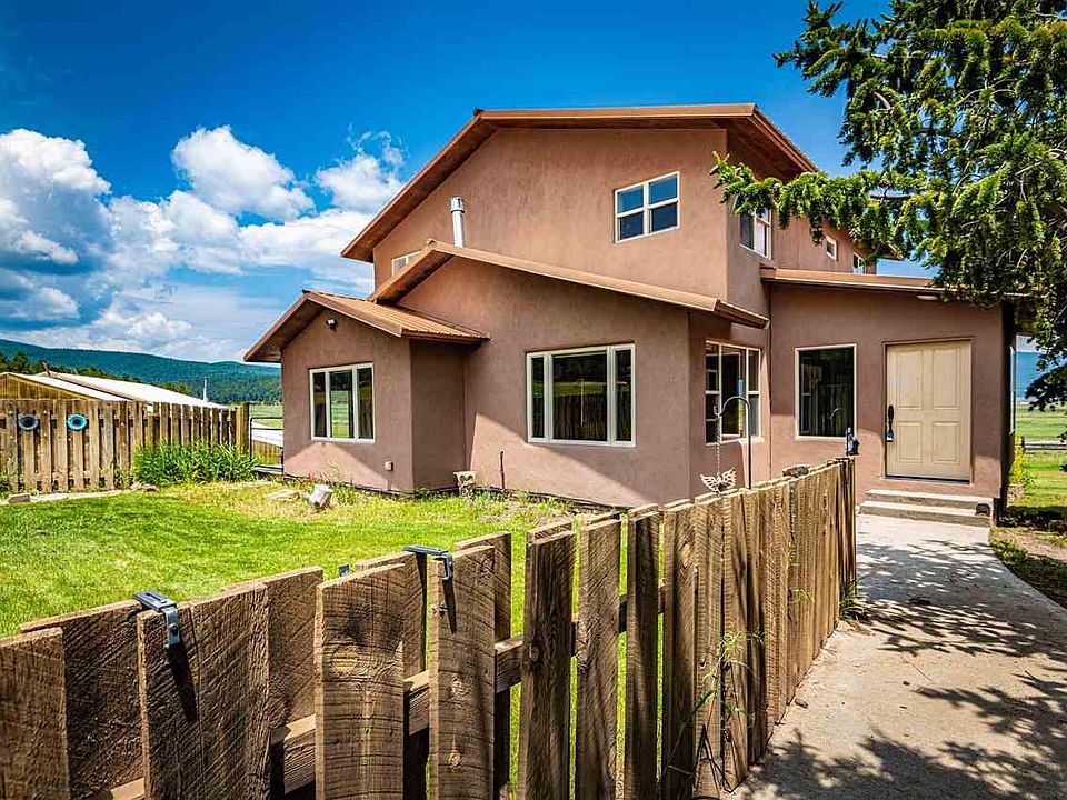 How unusual to find a house with a big garage/shop and greenhouse that is only 5 minutes from Angel Fire! No resort dues on this one! This house has 4 bedrooms and 2 full baths upstairs and the open living room/dining room/family room/kitchen/utility and half bath on the main level . Lots of windows all around the house to take advantage of the panoramic views. The landscaped courtyard is beautiful on the front of the house with a fenced in space attached. The kitchen living space flows out to a spacious 31 X 24ft deck/entertaining space complete with pergola and outdoor kitchen. The propane cook top is large enough to cook for the neighborhood! Little maintenance needed with the Timber Tech composite decking material. Entertaining at its finest here on this secure deck.....perfect for dogs or children who want to be outside and still under the watchful eye of others. This would make a great house to entertain family or guests with the entire main level opening to the outdoors. This house is off of the highway and main road through the subdivision to be free of traffic. The driveway and road to the house are both flat for easy year round access. Enter this house through a welcoming arch that leads to the landscaped yard in front or to the outdoor space to the side. The sellers have created two massive log benches and a large patio of pavers to accommodate an outdoor fireplace or chiminea . Plum and apple trees along with raspberry plants complete with watering system make this a fun addition. Once you are through the front door, a 160 sqft mudroom welcomes you to sit down and take off muddy shoes and enjoy the storage space for coats, hats, and toys. This entry foyer keeps the cold air and mess out of the family room. The Sellers didn't cut corners on the fireplace for their home. It is a high efficiency Mendota propane fireplace designed to heat up to 5200 sqft. The one of a kind custom mantle makes a real Rocky Mountain statement. The living room and kitchen have hardwood floors.The focal point of the kitchen is the large mahogany slab island. The stainless appliances including a Bosch gas stove and granite counter tops make this a gathering space for all cooks. Follow the path from the family room outdoors to the 32 X 40 foot insulated steel building heated by a wood stove. This shop area also has an insulated 15 x 16 room and an 8 X 12 room that would make a great studio or office. An attached greenhouse rounds out this multi-use space. This home is unfurnished, so you can truly make it your own mountain retreat.