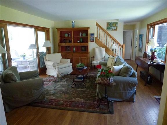 Hidden away on a very secluded lot in the Highlands rests this quintessential Oak Bluffs bungalow style home. Travel back to another era of a slow paced & relaxed vacation time. The screen porch is perfect for a quiet morning breakfast, or evening entertaining. The living room connects the porch and a large family style kitchen/dining room that will accommodate eight+ at the table. Built in 1993 by a reknown island contractor, the home features three bedrooms and two baths on the first floor with hardwood floors throughout. The master bedroom with ensuite bath and a separate sitting room/extra bedroom are on the second floor.