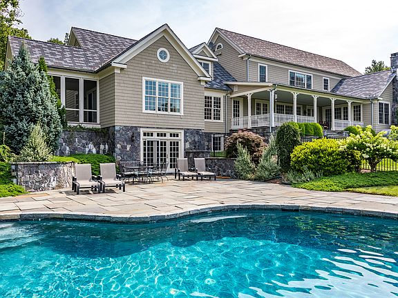 This Shingle Style residence is sited atop 23 high, private acres to take advantage of the spectacular 270? views of the distant hills and Roxbury farmland. Every amenity is included and the finest quality materials and workmanship are exhibited throughout. All rooms are generous in scale with high ceilings, abundant light, elaborate moldings, and beautiful wood flooring.Main Floor. The Living Room has a fireplace and 2 sets of French doors that open to an expansive bluestone patio overlooking the heated Gunite pool and stunning views. The formal dining room has paneled wainscoting. The professional cook's kitchen with island, granite counters, custom cherry cabinets, commercial grade appliances includes 2 sinks and 2 dishwashers and opens to the light-filled family/morning room with its vaulted ceiling, fireplace and French doors. Off the kitchen are a laundry room, half-bath and mudroom that leads to the garage. A wood-paneled library with floor-to-ceiling built-in bookshelves also opens to the patio and precedes the first floor Master bedroom with its own screened-in porch, tray ceiling, walk-in closet, dressing area and master bath with twin vanities, Jacuzzi tub and separate shower. A second main floor bedroom enjoys a full bath en suite and walk-in closet.Second Floor. Three more bedrooms highlighted by another Master that has a large dressing room with built-in drawers and shelving and two baths--one with Jacuzzi tub and separate steam shower and one with a marble shower. The other two bedrooms have baths en suite. Finished Lower Level. This level is very light and opens to the patio surrounding the pool. For after swimming there is a spa bath with two walk-in showers. A large family room as well as a perfect kids' playroom. A guest suite that includes a living room with fireplace. A wet bar adjoins the media room. There is even an ideal space for an au pair. There are two 2-car garages separated by a porte-cochere. Each garage has space above that could be finished to suit a variety of purposes. The property is composed of 2 parcels and includes both open and lightly wooded acreage. It has been handsomely landscaped and several stone fences run through it. Other features* Elevator* Security system* Central Vacuum* Custom Light fixtures* Multiple storage areas