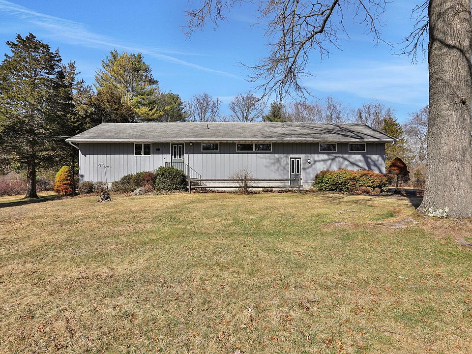 Rivka Estates, Blue Mountain. Three bedroom, two bath ranch on 1.1 acres. Well maintained home with cathedral ceilings in open living and dining area. Stone fireplace in the den with access to the back porch and deck. The large primary bedroom has oversized closet and full bath with stand up shower. Slate floors in entry foyer leads to tidy kitchen. Plenty of storage space in basement or in the oversized two car attached garage. Stone walls edge the level backyard with mature trees and bushes on either side providing privacy. This home has pond rights along with four other properties. Views of the Catskill Mountains to the west and a short drive to Village of Saugerties or Hunter Ski Area.
