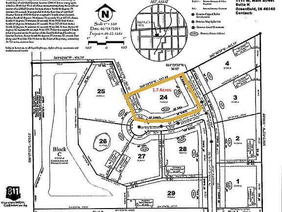 Welcome to Rockfield Estates, a new custom home community located between Greenfield Indiana and New Palestine Indiana within Southern Hancock Schools. This neighborhood provides direct access to the Pennsy Trail, a paved and maintained walking and biking trail that allows convenient outdoor recreation. Rockfield Estates offers 1.5 to 2 acre lots with options that include pond views and tree-lined settings. The community features natural gas, streetlights and sidewalks. Soil testing has been completed, and well and septic are required. Lot 24 includes 1.7 acres with a corner lot and is located on a cul-de-sac. Community guidelines allow fences and 2400 square foot pole barns. Minimum home size is 2400 square feet for a one story and 2600 square feet for a two story, with at least 1600 square feet required on the main level. Vinyl siding is not permitted. Approved builders are required. Joyner Homes is currently the approved builder for Rockfield Estates and can build custom plans or offer their available designs. Other builders may be considered with developer approval when submitted at the time of the lot offer. Additional lots are available and reservations may be made while inventory remains available.