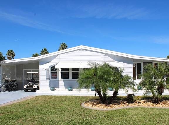 Listed by the OFFICIAL SALES CENTER of this Community. This is the home you've been waiting for! Updates galore, in a great location backing to a canal. Newer roof-over, vapor barrier, windows, central air conditioner, sliding glass doors, plywood subfloor, wood-look laminate & carpeting, interior paint and more. Completely updated kitchen with new cabinets, countertops and appliances. Inside laundry with Maytag stackable washer/dryer. Enclosed 10 X 30 lanai has dedicated a/c, thermal pane windows & opens on to 12 X 16 raised deck with canal views. Paver back patio, great for grilling. Side lanai has diffused screen for privacy and sun shades. Storage shed with a/c, shelving & table, perfect for a workshop or a hobbyist. Lush landscaping with concrete curbing, painted driveway with paver accents. You need see this home to appreciate all it has to offer. Turn key furnished and move in ready!! Golf cart negotiable. This home is in a very active, 55+ community with many clubs, sports and activities for the residents. Amenities include two swimming pools, three clubhouses, hot tub, sauna, state-of-the-art fitness center, library, billiard room, shuffle board, tennis courts and pickle ball courts. HOA fee includes: site lease, water/sewer, trash/recycle, lawn mowing, basic cable, 24 hour attended gatehouse and access to all community amenities.