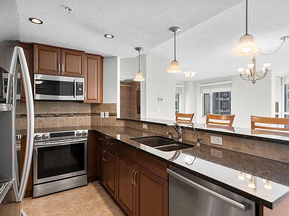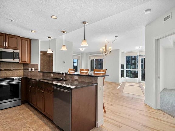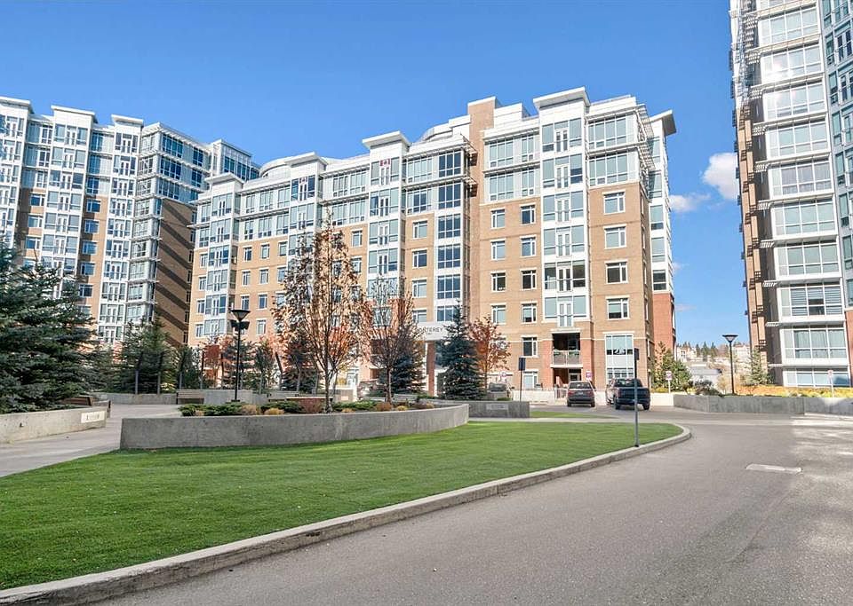 Welcome to The Groves of Varsity, in Varsity Estates, one of the best neighbourhoods in the city. This well-planned corner suite with two bedrooms and two bathrooms has a fabulous front entrance foyer and is surprisingly quiet and spacious. Walk into an open floor plan with newly finished hardwood and a well-appointed kitchen with raised bar seating and quality appliances. The primary bedroom boasts a huge walk-in closet and a luxurious ensuite with a shower and two sinks. The spacious second bedroom, complete with cork flooring, has a four-piece main bathroom that's located on the opposite side of the living area, allowing for privacy while hosting guests. A separate laundry room includes an oversized washer and dryer. It has also been freshly painted, and the condo faces south, providing plenty of natural light. Nine-foot ceilings and individually controlled heat and air conditioning are welcome additions. Titled underground parking in a prime location and a separate storage area are also included. The building is made of steel and concrete, making the unit and common areas very quiet. There's an on-site property manager during business hours who is accessible to all residents, and a BOMA-certified caretaker is also on-site to ensure everything is running smoothly. The condo community offers amazing rooftop amenities year-round! These include a well-equipped private gym, steam rooms, a meeting/party room, and a mountain-view terrace with BBQs. An on-site professional building includes a doctor's office, pharmacy, coffee shop, and more. Just steps from the Dalhousie LRT station and within walking distance of parks and shopping centres, this condo is ideal for all lifestyles. Whether you're a retiree, young professional, or student, this home is close to the University of Calgary, Foothills Hospital, and several amenities! Plus, it has easy access to the mountains via Crowchild Trail and is an easy fifteen-minute drive to downtown Calgary. Stoney Trail (the ring road) is also close by, providing great access to the entire city, and Market Mall is just a short five-minute drive away. Pets are welcome with board approval.
