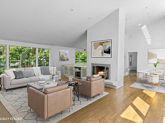 This stunning contemporary home redefines modern living with its clean lines, dramatic vaulted ceilings, and walls of glass that flood the interior with natural light. Fully renovated in 2016, the open-concept living area seamlessly blends indoor and outdoor spaces, creating an entertainer's paradise. Imagine hosting gatherings on the expansive deck overlooking the heated pool and spa, or enjoying more intimate moments in the screened porch. This home offers the ease of one-level living, featuring a spacious living and dining room with a striking central fireplace and soaring vaulted ceilings. The open-plan kitchen, designed for both style and functionality, features high-end appliances and effortlessly connects to the dining and living areas, making entertaining a breeze. Retreat to your private primary bedroom wing, complete with a dedicated office area and a luxurious en-suite bathroom. Three additional bedrooms, each situated in their own wing, provide ample space and privacy for loved ones and guests. The finished lower level expands the living space with a large media room, a gym, and generous storage space. Tranquility abounds on the beautifully landscaped grounds, visible from every room in the house. Located minutes to East Hampton Village and to world-class bay beaches, this exceptional home embodies the coveted Hamptons lifestyle, offering a perfect blend of sophistication, comfort, and effortless elegance in a totally private setting.