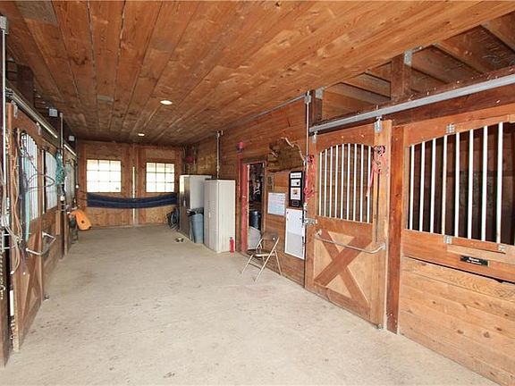 Exceptional 17-acre horse farmette built for an equestrian business. 10-stall barn features wide concrete aisles, a tack room, & functional layout ideal for boarding, training, or lessons. The upper loft offers flexible open-span space perfect for a conference room, office(s), & kitchenette, plus washer and dryer hookups for daily barn-life convenience. Approximately 15 acres are in divided pastures w/ 4-wire coated electric fencing, designed for efficient turnout & safe rotation. 2-story bank barn provides serious storage, including room for 1,500+ square bales, a grain room, & a concrete lower level ideal for a workshop, equipment storage, or small machinery bay. Enclosed, covered 60’ diameter Equi-Cover round pen, giving you year-round ride time. The land has not been treated w/ chemicals, offering a great start for those wanting an organic-minded property. Abundant water well. Security keypad doors plus a burglar alarm/ADT system is transferable add peace of mind.