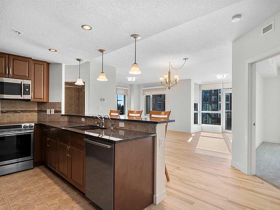 Nine-foot ceilings and individually controlled heat and air conditioning are welcome additions. Titled underground parking in a prime location and a separate storage area are also included. The building is made of steel and concrete, making the unit and common areas very quiet. There's an on-site property manager during business hours who is accessible to all residents, and a BOMA-certified caretaker is also on-site to ensure everything is running smoothly. The condo community offers amazing rooftop amenities year-round! These include a well-equipped private gym, steam rooms, a meeting/party room, and a mountain-view terrace with BBQs. An on-site professional building includes a doctor's office, pharmacy, coffee shop, and more.