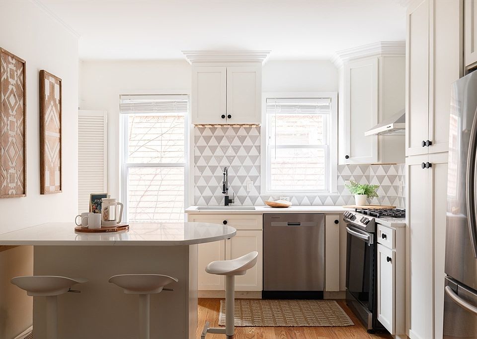 Set along a quiet North Cambridge street, this revitalized two-bedroom, one-bath home pairs interior updates with rare urban amenities—a private south-facing yard, two-car driveway, and an exclusive ~300 sft garage. A 2021 renovation redefined the home’s core with an open kitchen, dining, and living layout enhanced by high ceilings, hardwood floors, and abundant natural light. The kitchen features quartz countertops, a geometric tile backsplash, stainless steel appliances, a peninsula island with seating, and a walk-in pantry. Two bay-windowed bedrooms flank the front of the home, while a full bath offers a waterfall shower, towel warmer and storage. The living room opens directly to a fenced-in backyard and raised deck framed by mature trees. Additional storage and shared laundry are located in the basement. Just off Mass Ave near the Minuteman Bike Path, this home offers effortless access to Davis, Porter, Alewife, and Harvard Squares.