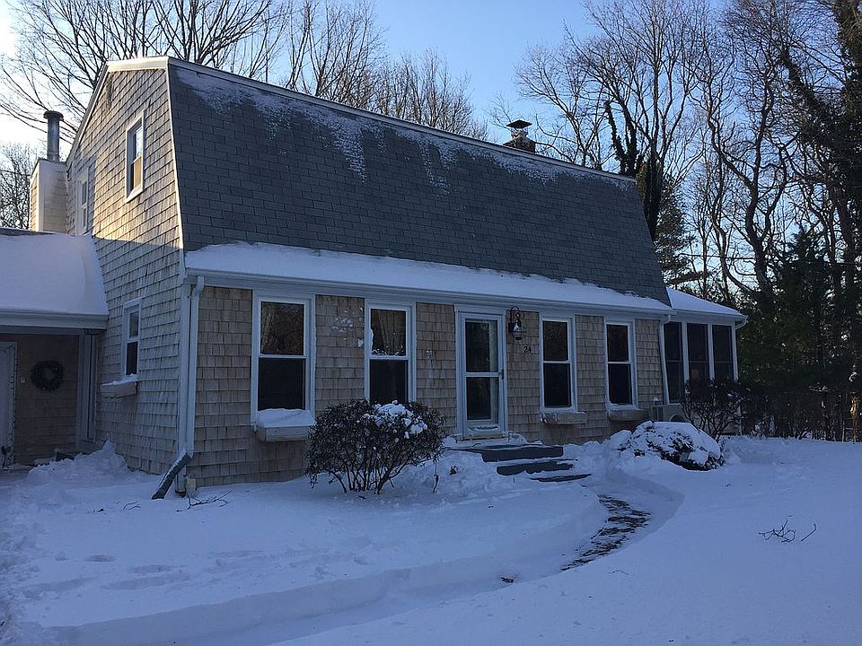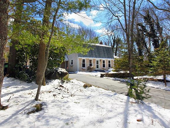 Gambrel roof Cape Cod with grey shingled exterior. Set on over an acre of land with mature trees, lawn, and loads of gorgeous perennials. Short walk to freshwater pond with private beach and boating rights. Big open deck for entertaining. Mini-split heat and a/c on main level; room a/c units upstairs. Year-round sunroom with baseboard heat and ceiling fan. Finished basement with half bath and laundry, zoned electric baseboard heat. New roof in 2012. Hard wired generator. Updated septic. Solar panels and battery backup. Outbuilding.
