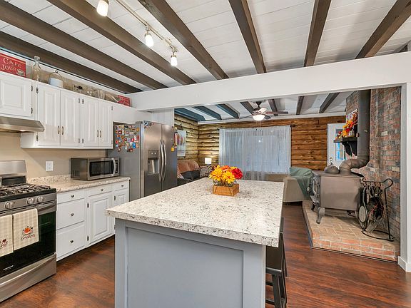 Log homeBeautiful islandFire pitThree bedroomsGiant deckTwo bathroomsPropane stove