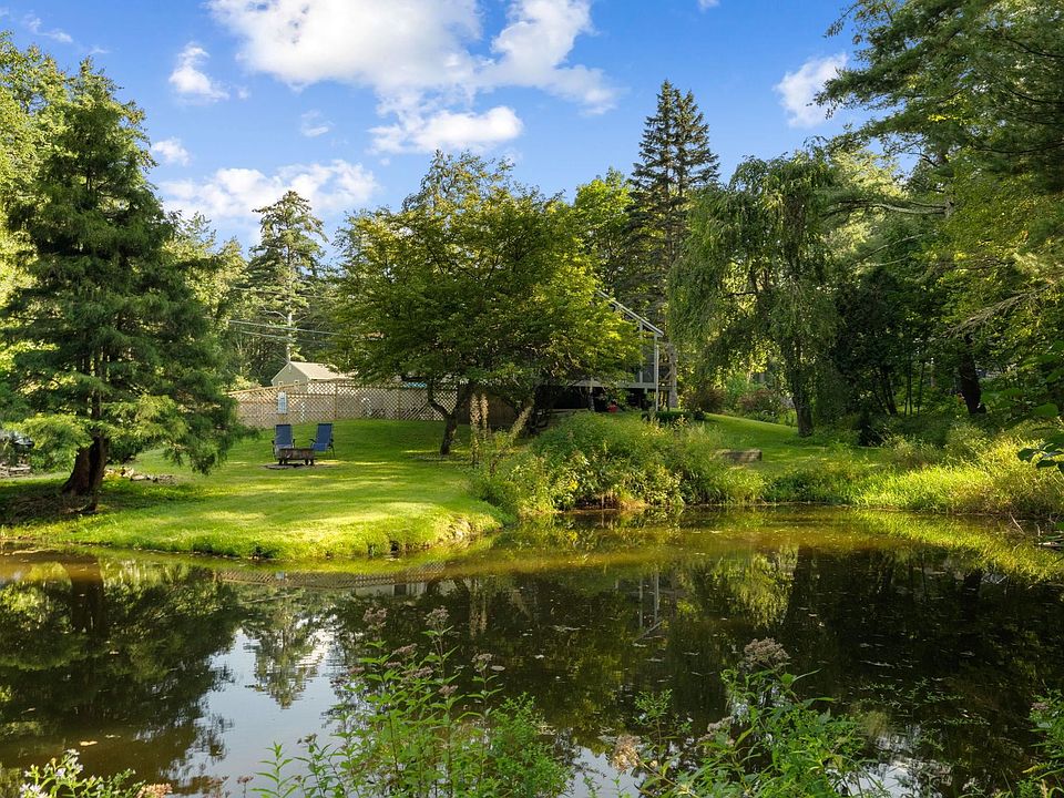 OPEN HOUSE CANCELLED FOR SATURDAY 9/23. SELLER ACCEPTED AN OFFER.Not your typical cookie cutter home! Have you ever wanted to be close to everything but have your own backyard oasis? You will find that here! Enjoy your dinners on the screened porch overlooking your own pond and lush gardens and babbling brook! On the lower level you will find a solarium for all your plants, a primary bedroom suite with its own seating area leading out to the fenced back yard area & tons of closet space and a walk in shower with laundry. A 2nd bedroom is on the same level. Head on up the circluar staircase to the main level complete with 3rd bedroom w/hardwood floors & tons of natural light! If you love to entertain, a large dining room with built ins & a large living room with a gas fireplace will sure to please you. The kitchen provides extra sunlight with a skylight and a mid century modern vibe. Plenty of counter space and a double sided butcher block island for those who like to cook & need storage. This home features cedar siding, a newer paved driveway, Buderus heating system, Newer Septic & Newer Windows, New Oil tank, New Carbon colored LG washer & dryer included. Check out the 3D tour!