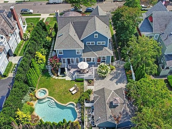 Spacious and move-in ready, this six bedroom shore Colonial is perfectly situated just steps to the beach and north end pavilion. Appreciate ocean views from the oval blue-stone porch and master bedroom balcony. Hardwood and ceramic floors throughout the first level with a chef's kitchen that overlooks the pool and backyard. The walk-out basement, complete with movie-theatre, game room, kitchen and gym will suit all your indoor entertaining needs. For outdoor entertaining, the salt-water pool and spa flank the maintenance-free deck that leads into the large, light-filled and open first floor living spaces. Spring Lake offers fine shops, restaurants, a two-mile boardwalk, lakes and beautiful beaches. There is easy access to the GSP and train service to NYC and Newark airport.
