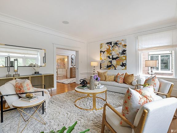 Lovely, classic Inner Richmond home close to Lake, Clement and the Presidio! This house has a stellar floorplan with a great combination of Edwardian detailing with recent renovations. On the main level, a bright front living room boasts a fireplace flanked by shelving, while the oversized formal dining room has been opened up on either side of built-in cabinetry to create a great-room concept. The highly functional kitchen has both an island and charming adjacent lounge area overlooking the roomy deck, perfect for bbqs, and accessing the garden. Upstairs the primary bedroom has multiple closets and an ensuite bathroom with double sinks and a spacious shower enclosure, while two back bedrooms share a hallway bathroom as well as access to a very large sun-filled office or playroom. The lower level family room has windows out to the side yard and French doors opening onto the flat, usable garden, as well as a full bathroom at this level. A roomy 1 to 2 car garage and laundry complete the picture. Move right in!