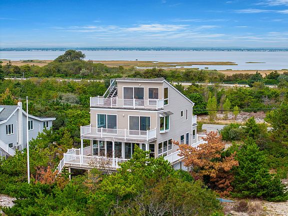 Summer cottage or year-round retreat? Whatever you choose, there’s no better location in Oak Beach: right along the sandy shores of Sore Thumb Cove. This 4 bed/2 bath waterfront home delivers unparalleled views of the cove, Fire Island, the Atlantic, and the Great South Bay, with roof-deck vistas that span NYC and the Robert Moses Bridge. Spend lazy days basking in the sunlight pouring through the windows or head out to one of the home’s many decks to sip your morning coffee or enjoy an afternoon refreshment. The centerpiece of the main floor is the open concept living/dining room with windows on three sides and a cozy pellet stove, surrounded by kitchen, bedroom, 3/4 bath, and laundry. On the second floor, two spacious bedrooms overlook the cove and the ocean, while an L-shaped lounge includes views across the bay. A full bath with separate tub and shower, plus vanity with two sinks, completes this level. Sea and bayviews continue on the top floor, which features a bedroom or den and mezzanine with sitting area. Down on the ground level, parking is a breeze. The large garage has room for your car and everything else, while the oversized yard provides extensive parking for guests. All of this is just steps from the beach, where you can swim, kayak, paddleboard, or stroll with your dog over