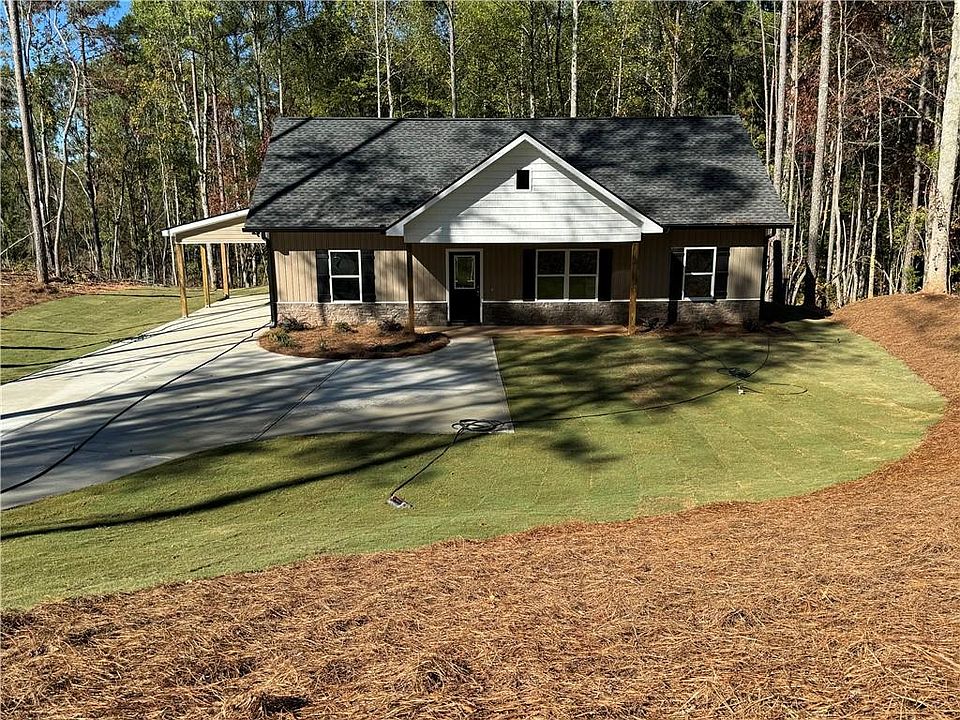 Nestled on a picturesque one-acre lot, this stunning new construction home offers the perfect blend of modern amenities and charming details. The inviting rocking chair front porch sets a welcoming tone, leading you into a thoughtfully designed interior that boasts three spacious bedrooms and two well-appointed bathrooms. The expansive primary bedroom is a true retreat featuring a massive walk-in closet and an en-suite bath with a luxurious double vanity. White kitchen cabinetry and a roomy pantry off the eat in kitchen provide both style and ample storage space along with granite countertops and a large kitchen island, this space is perfect for preparing meals. An electric fireplace adds a cozy touch to the family room/living space. Step outside, and you'll find a beautifully landscaped yard that enhances the property's curb appeal and offers plenty of space for outdoor activities. A concrete walkway connects the one-car carport to a generous 20 ft x 8 ft patio, ideal for entertaining guests or enjoying a quiet evening under the stars. LVP through out home and plush carpet in bedrooms. 2 piece crown in primary and living room and kitchen, a 2.5-ton heat pump with a circulation pump on the hot water heater. This home is designed with privacy and comfort in mind, making it a perfect sanctuary for its future owners. Construction Now Completed.