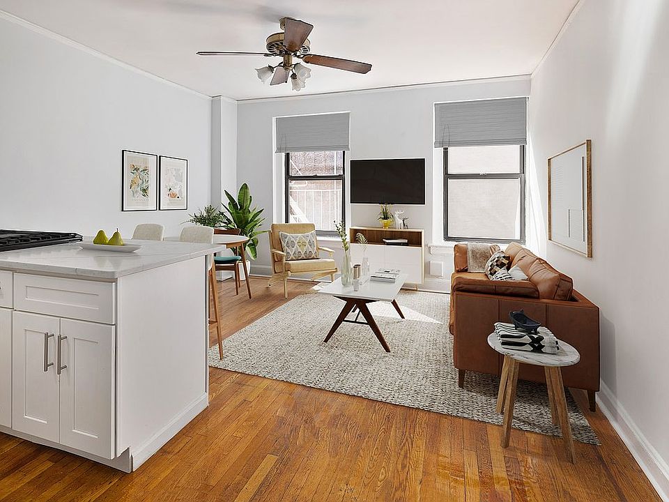 Corner One bedroom, two short flights up in a small intimate coop with low maintenance ($1,201) . Recently installed Central AC split units in both living room and bedroom. Quietly facing into the common garden with blue sky and tree top views This open-airy floor plan lends itself to entertaining & allows an abundance of light throughout space. The gracious arched entrance foyer flows nicely into the recently renovated open kitchen with a breakfast bar that has cabinets on one side for additional storage space.