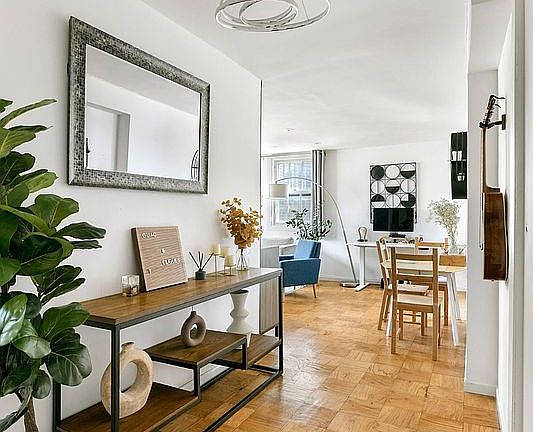 Welcome to Residence 10B at 240 East 35th Street, a spacious one-bedroom, one-bath co-op offering well-proportioned living. A generous entry foyer opens into the expansive north-facing living room, designed for both entertaining and everyday comfort. The windowed kitchen features clean white cabinetry, granite counters, and full-size appliances, including a Bosch dishwasher. The bedroom easily accommodates a king-size bed and additional furnishings, while multiple closets throughout the home provide excellent storage. Details such as parquet floors, modern accent walls, and oversized windows bring both warmth and style to this inviting home.