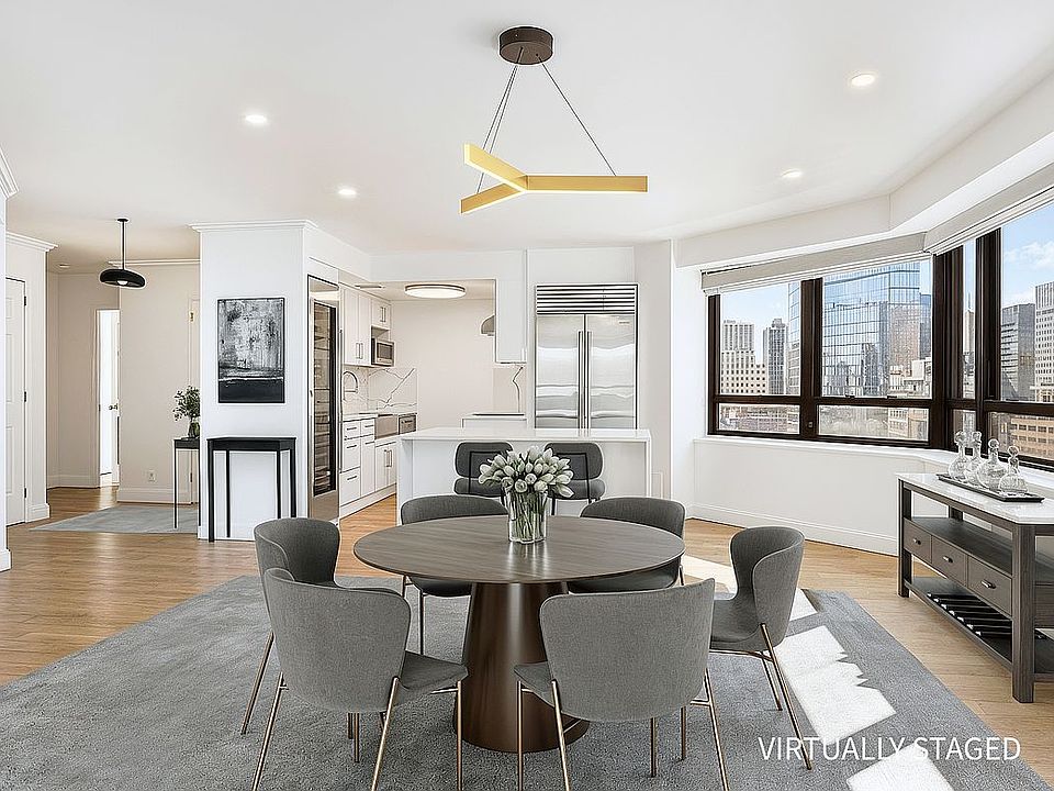 Enjoy a light-filled, open-plan living/dining room with a renovated kitchen, outfitted with quartzite countertops and a waterfall island, white lacquered cabinetry, a Sub-Zero refrigerator, wine storage, a Wolf Stove, a Miele Dishwasher, and custom fixtures. It is the perfect place for morning coffee, overlooking the Chrysler Building and the Manhattan skyline.