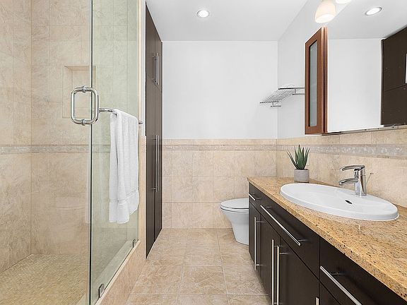 The tastefully renovated windowed kitchen is well-equipped with stainless steel appliances, ample storage space, and a custom-tiled backsplash. The sun-filled, generously proportioned primary bedroom offers an en-suite tiled bathroom including a washer and dryer closet. The second bedroom features open city views and plenty of closet space, while the second full bathroom off the living room completes this offering.