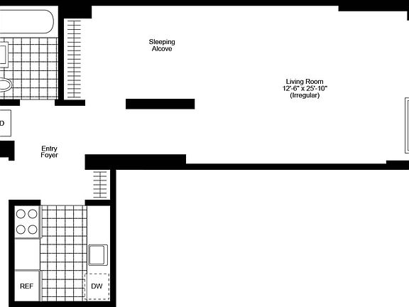 Spacious alcove studio with plenty of space for living and sleeping. Apartment features floor-to-ceiling windows, wood floors, an in-unit washer/dryer.