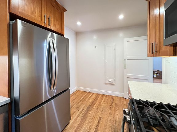 Large 1 bedroom, 1 bath apartment located on the 2nd level just received an entirely new bathroom and floor plan complete with Carrera style porcelain tile, large, framed mirror and slate blue vanity with plenty of drawers and counter space and shower over tub enclosure with sparkling glass doors. The beautifully remodeled kitchen has plenty of soft close cabinets and drawers, Quartz countertops, Subway tile backsplash, Stainless Steel appliances including a brand-new counter depth fridge with ice maker, gas stove with a self-cleaning/convection oven, quiet dishwasher, new microwave and under cabinet lighting. The unit also features a separate dining room, fireplace (aesthetic only) and LED recessed lighting throughout.