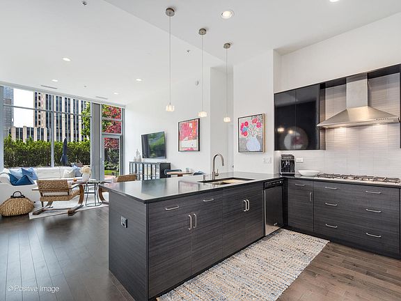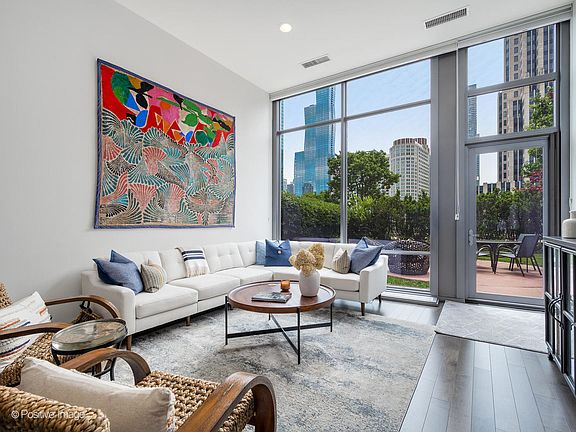 This one-of-a-kind residence offers the rarest of luxuries in city living: a true backyard in the sky. Anchored by an expansive 1,200+ square foot private terrace, this remarkable 2 bedroom + office/den, 2.5 bath home blends the ease of indoor-outdoor living with breathtaking views of the Navy Pier fireworks and Chicago Skyline. Professionally landscaped and fully equipped with lighting and irrigation, the terrace is maintained by the building and provides an incredible outdoor escape. Inside, dramatic 12-foot ceilings and floor-to-ceiling windows flood the space with natural light. The wide, thoughtfully designed layout includes two spacious en-suite bedrooms, a powder room, and a large den currently outfitted with custom built-ins for a dreamy, highly organized work-from-home space that feels both stylish and functional. The kitchen is a stunning centerpiece, featuring an oversized island, top-tier appliances including a multi burner gas cook top and double ovens, and extensive custom cabinetry. The sunlit primary suite offers a spa-like retreat with double vanities and a walk-in shower, while the second en-suite bedroom provides privacy and comfort for guests or extended stays. Additional features include wide-plank hardwood flooring throughout, designer lighting custom window treatments, and beautifully integrated storage solutions. There is an opportunity to purchase all existing furnishings and the curated art collection, allowing for a seamless, move-in-ready experience. Premium garage parking located just steps from the elevator completes the package. Located in one of Streeterville's most prestigious full-service buildings, residents enjoy 24-hour door staff, two fitness centers and a private training studio, outdoor pool, sundeck, media screening room, business center, dog run, on-site dry cleaning, and easy access to Whole Foods. With the lakefront, riverwalk, Michigan Avenue, and Chicago's finest shopping and dining just outside your door, this home offers an unmatched lifestyle in one of the city's most dynamic neighborhoods. A residence of this caliber with private outdoor space on this scale offers a level of comfort and exclusivity that's nearly impossible to replicate.
