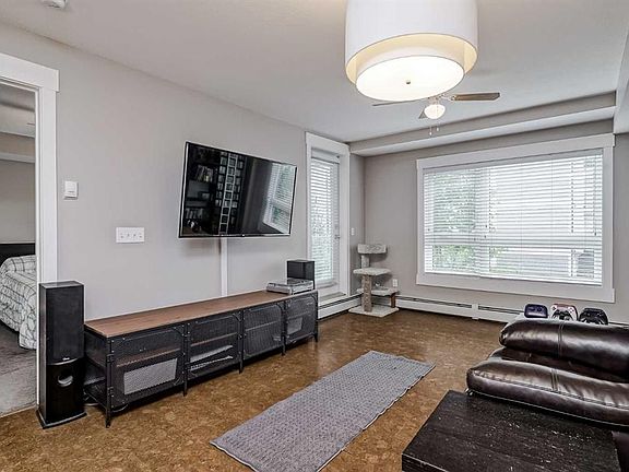 Welcome to Skymills in Skyview Ranch – Stylish, Modern & Maintenance-Free Living! Step into this showhome-quality, like-new condo that blends comfort with convenience. Perfectly designed, this open-concept second-floor home is filled with natural light thanks to its wall-to-wall windows and spacious layout. The gourmet kitchen is a chef’s dream, featuring a peninsula island with breakfast bar, stainless steel appliances, ample cabinetry, and a functional dining space. The bright living room opens onto your private balcony—the perfect place to relax or entertain, complete with a natural gas hookup for your BBQ. Your primary bedroom retreat offers a wall-to-wall closet and plenty of natural light. Additional highlights include in-suite laundry and a titled surface parking stall for your convenience. Ideally located, you’ll enjoy being minutes from CrossIron Mills, schools, shopping, public transit, and quick access to Deerfoot & Stoney Trail. Move-in ready and maintenance-free—this Skymills condo truly has it all!