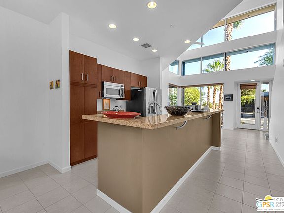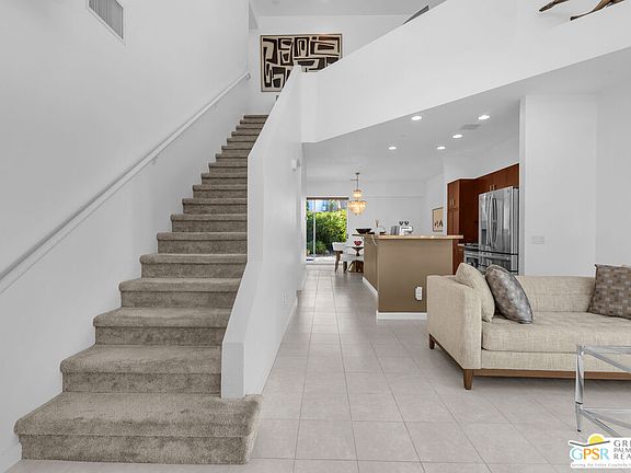 Located in Palermo, one of Palm Springs' most desirable gated communities, this rare Floor Plan A southeast-facing corner unit combines modern design with desert serenity. Featuring a 24-panel owned solar system, it delivers impressive energy savings and sustainability without sacrificing style. Dramatic two-story windows frame mountain views, complemented by new flooring, fresh paint, and a new HVAC system (April 2025). As you enter, soaring two-story windows draw in abundant natural light and showcase sweeping mountain views, creating a bright and airy atmosphere. The interior features new flooring and fresh paint inside and out, offering a clean, modern feel throughout. Upstairs, two generous en-suite bedrooms each open to a shared, oversized upper deck through sleek glass slidersan ideal spot to unwind and take in the sunset against the mountain backdrop. Outside, enjoy the privacy of your own space with plenty of mature vegetation, newly remodeled spool, covered built-in gas fireplace, and BBQ grill hookup. Upstairs, two en-suite bedrooms share a large deck; the primary offers a walk-in closet and dual-vanity bath. Other features include an EV-ready garage, personal driveway, and best of all it sits on FEE land -- so you own it outright! The HOA covers water, trash, maintenance, and resort-style amenities such as a fitness center, community pools and spas, and Billiards room. With direct access to Indian Canyon Drive, the home is just minutes from Uptown's Design District, plenty of dining, shopping, trails, and more. Reach out today to schedule a private showing!