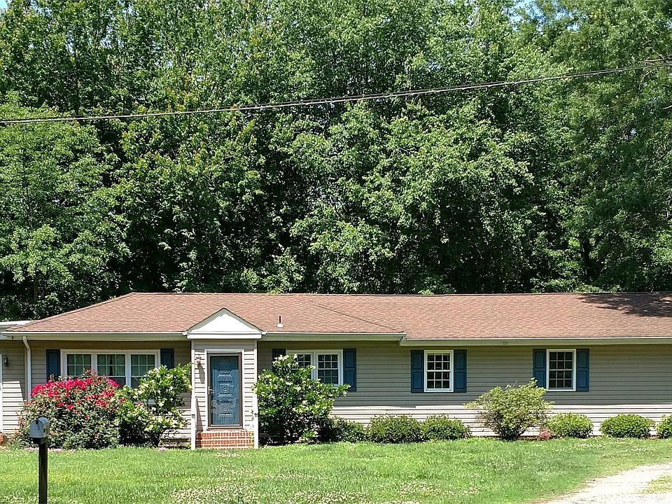 ALL GREAT BRIDGE SCHOOLS and a very large yard. This 4 bedroom ranch has a bonus room on the side with separate exterior entrance and LVP flooring. Heart of pine wood floors in the living room and two bedrooms separated by a full bath on the hall toward the back of the house, an additional bedroom on the front of the house past the kitchen and dining room, and at the end of that hallway, the master bedroom with walk-in custom closet and private bath as well as an exterior entrance to the back deck.