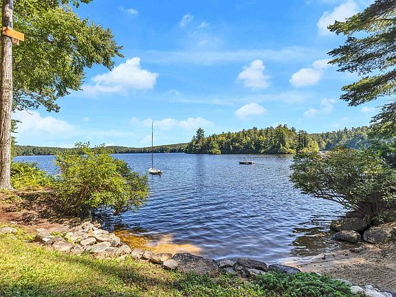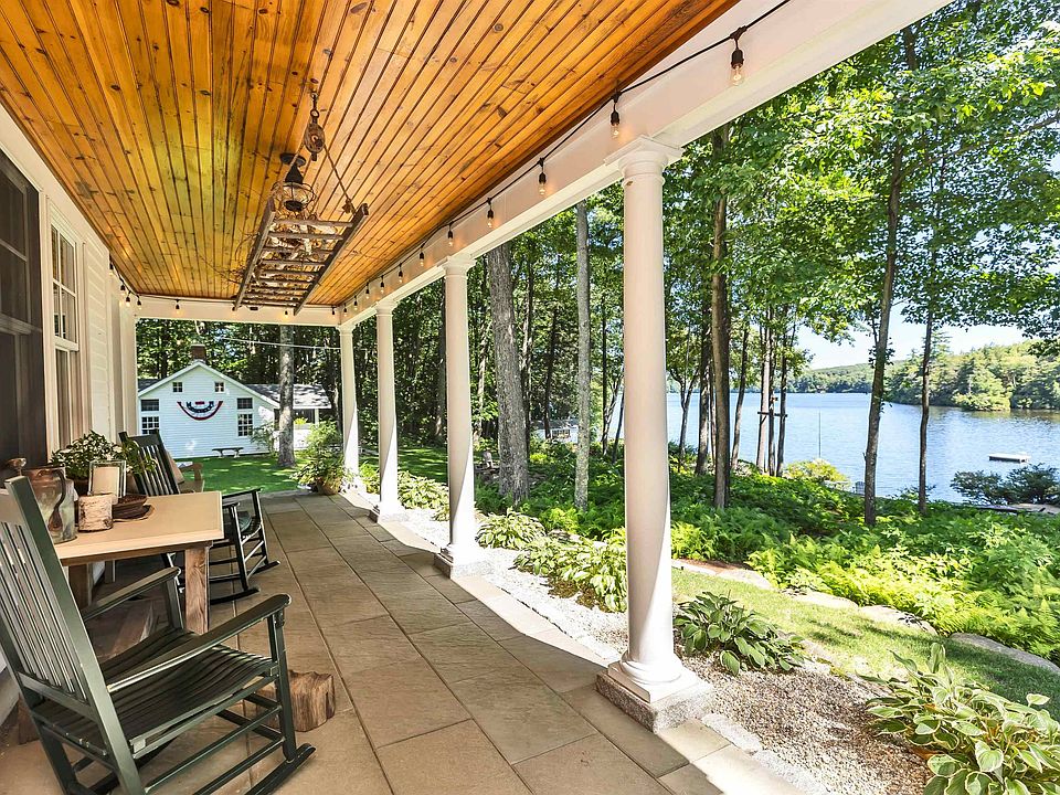 Set well back from a quiet gravel town road...in it's enviable setting offering complete privacy on one of the highest quality water bodies in southern New Hampshire...is this distintive family compound. The architect designed and custom built c.2008 main house offers broad water views from it's spacious high ceiling craftsman style interior and features a stone fireplaced great room, gourmet kitchen with dining alcove with water views, first floor guest room and easy access shower bath, delightful large screen porch with seating cluster, brick floored open columned covered terrace facing the waterfront and delightful high posted garden room with custom granite flooring and gas fireplace hearth. Upstairs are two family bedrooms with attached full bath, office alcove, and a magnificent cathedral ceiling owners bedroom suite with delighful view over property to water and custom bath en suite. 32x24 bluestone entertaining terrace enclosed with fieldstone walls includes hot tub and wood fired pizza oven. Large beamed construction utility barn serves as high posted two car garage. Gravel walkways lead to a charming one bedroom seasonal guest house with cathedral ceiling entertaining space, country kitchen, private shorefront screened porch and an adjacent bukhouse building for additional friends and family. The fully developed shoreline includes boathouse, private docks and private sandy beach. Buyer's proof of funds required. The region's finest waterfront compound awaits!
