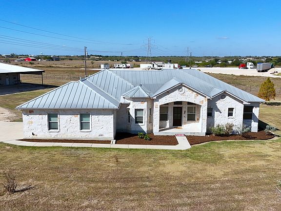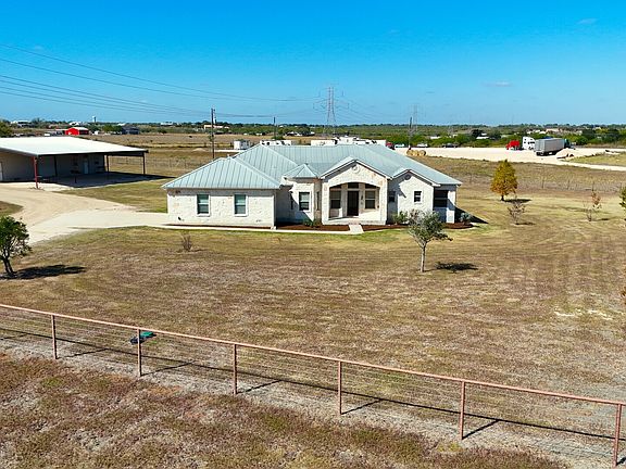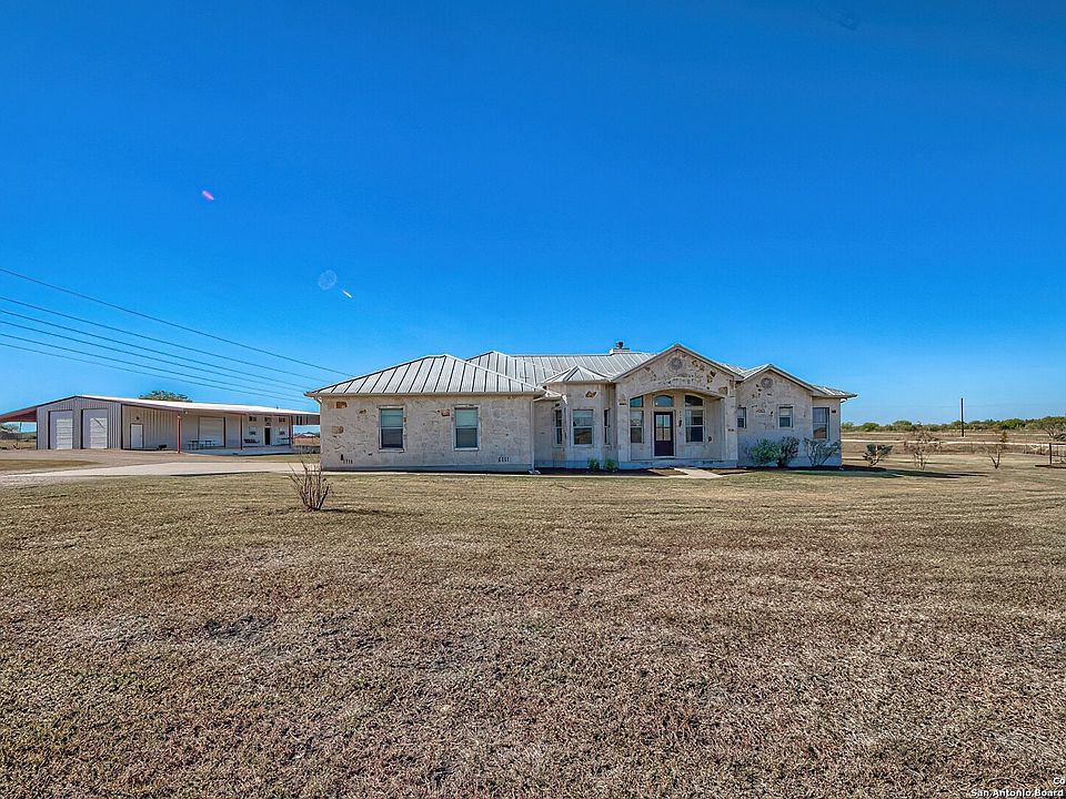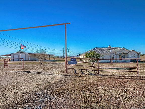 LIVE AND WORK WITH EASE AT THIS UNRESTRICTED MARION 6 ACRE SPREAD THAT COULD EASILY SERVE AS A MULTI-GENERATIONAL FARMSTEAD OR BUSINESS. Conveniently located just 15 minutes from New Braunfels, Seguin and Lake McQueeney, 30 minutes from San Antonio and only an hour to Austin, the location is close to so many hubs. See the level acreage sweeping in front of you as you pull off FM 1044. Pastureland precedes a beautifully updated limestone Hill Country single story home with the huge live-in workshop tucked behind. Behind an electronic gate, slip onto the practical circular drive be welcomed into the open floor plan with a chic farmhouse feel awash with natural light. The large foyer dressed up with shiplap wall opens into the living/dining/kitchen space with its 12 foot ceilings. A centerpiece limestone fireplace sets a cozy atmosphere while the renovated kitchen with its giant island, marble look quartz countertops and white shaker cabinetry make you feel you've stepped into an episode of HGTV. Entertaining is made easy with the bar at the island, the adorable breakfast nook with window seat, and spacious dining room with view of the back acreage and your outdoor covered patio. A built-in wall unit with floating wood shelving and shiplap accent makes a statement while still being practical. At the primary bedroom wing find a guest half bath with more floating shelves and shiplap. Down the hall enter the primary sanctuary--large bedroom with nook, ensuite bathroom with dual sinks, long vanity, deep tiled, walk-in shower and large closet with built-ins. Double french doors lead from the bedroom to a flex space with another walk-in closet. Use this as an office, nursery, exercise or second living room. On the opposite wing sits two spacious bedrooms that share a jack-and-jill style bathroom with two separate vanities and tub/shower combo behind doors for privacy. The indoor laundry room that leads into the two-car, attached garage with utility sink, windows and room for storage. Or convert this, if you like for more living space, as you have a massive workshop only steps away for vehicle storage or more. The Rent out the shop apartment for income, house your company foreman here or turn it into a fancy office. At 1456 square feet, two bedrooms, one bath, living, dining, kitchen and loft with 15 foot ceilings, this space would comfortably serve as an AirBNB or a second residence. Designer touches like the floating wood shelves that mirror the main house and stained concrete floors give this space an unexpected panache. The smart design of the 40x40 foot metal workshop on slab offers amazing opportunities for so many uses. With 15 foot ceilings and four roll-up doors on three sides of the building you can store RVs, horse trailers and more here. The roomy loft that overlooks the shop floor would be ideal for an office space and the ground floor work table makes this job-ready. The roof overhangs (65x25 feet and 65x31 feet respectively were designed for a multitude of uses--including equipment storage or 4-H livestock stalls. An open air horse barn on one side could happen with just prefab stalls if you want to go fancy or merely fence panels for paddocks. The panoramic acreage is begging to be horse pasture, a hay field or plant something else as sandy loam cultivates well. Being outside city limits, in Guadalupe County, enjoy an incredibly low property tax rate of 1.4 while still having the benefit of being zoned for coveted Marion ISD. Try to find something in such a brilliant location, move-in ready with two residences and a shop with livestock capabilities ... these make this property a complete package that will be hard to recreate elsewhere at this price. Check it out to find it checks all your boxes and ones you didn't even know you should have on the list! Hurry!