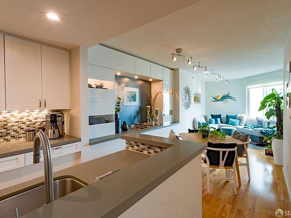 Quartz countertopsSleek lacquered cabinetryTile backsplashModern kitchenWalk-in closetPeek-a-boo bay views