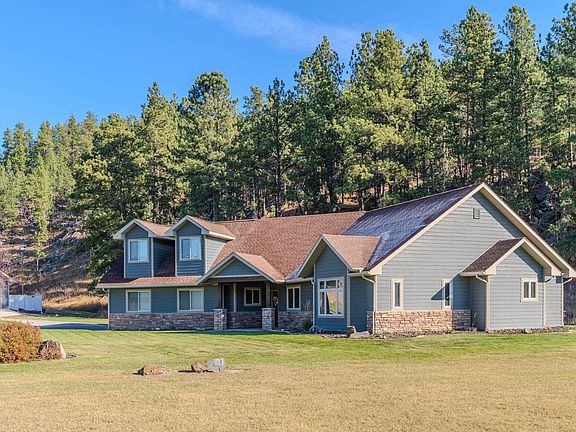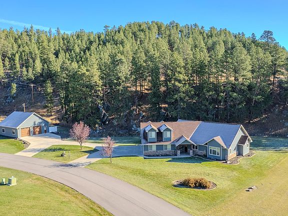 RARE BLACK HILL HIDDEN TREASURE! Wonderful Hill City Location! ABSOLUTE SPLENDOR FROM TOP TO BOTTOM! Glimmering open-concept 1.5 story bursting with curb appeal in a serene setting on just under an acre with great Hills & lake views, a thick pine tree backdrop, and touching miles upon miles of USFS lands! Chef's delight eat-in kitchen showcases a 2-tiered center island, heaps of granite countertops, rows of custom cabinets, stainless steel appliances, 2 walkouts accessing the patio & backyard, plus striking luxury vinyl tile flooring with electric hydro in-floor heating extending into an ample formal dining room area & great living room with cozy stone-encased gas fireplace & vaulted ceiling. Luxurious main floor master suite with brand new carpet and a private bathroom highlighting a double vanity, whirlpool tub, and walk-in tile shower. Expansive main floor hosts a good-sized guest bedroom, 2nd full bathroom, and convenient laundry with stackable washer & dryer that stay. Upper level holds an ample 3rd bedroom, 3rd bathroom, and mini split system. Lovely back patio with pergola and built-in counter with grill. 32x24 2-stall attached garage with small fenced-in area behind it plus a 34x34 2-stall detached garage built in 2017 with bar & kitchen area and substantial loft, for a generous amount of storage options! Schedule your tour today! Adjacent 0.34 acre lot available for purchase.