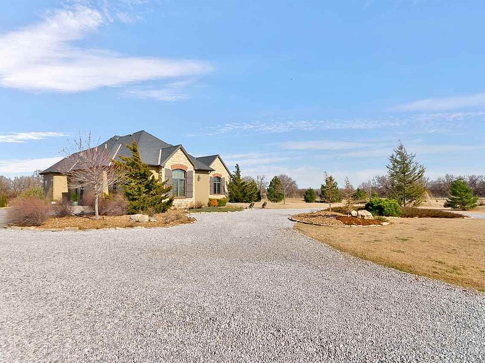 Welcome home to over five gorgeous acres conveniently located in Goddard! This custom-built executive home boasts over 5,000 sqft with 6 bedrooms, 4 full bathrooms, 1 half bathroom and an attached oversized 3 car garage. As you walk through the front door, you step into a large foyer, great for welcoming guests. A well-appointed floor plan offers a main floor master suite, on-suite bath, two-way fireplace, walk-in closet, and has French doors, which open to the deck. Fit for a chef, the kitchen has double ovens, a six-burner gas range, appliance garage, indoor grill, and a warming drawer. Custom cabinets are faced in a beautiful distressed knotty alder. Above the island is a hand-made range hood made in Columbia over 100 years ago. French doors lead to the formal dinning room, perfect for the dinner parties. In the lower level, amenities abound; family room with a wet bar, four additional bedrooms, and two full bathrooms. Two of these bedrooms share a Jack and Jill bathroom. One has its on on-suite bath. In addition, on this level, enjoy the 17 X 15 craft/bonus room (used as an art studio), and a large concrete œsafe room with a steel door. Windows span the back of this home, showcasing incredible views, welcoming the natural sunlight. Outdoor living and entertaining space includes a deck overlooking the 20 X 40 salt water pool and landscape. Included on this property is a 30 X 50 detached shop with additional climate controlled finished living space. On the shops main level you will find a finished office area and full bathroom. Upstairs is a finished living area and separate bedroom. This outstanding property offers country living at its finest with easy access to all of the amenities of the city; schedule your private showing today!
