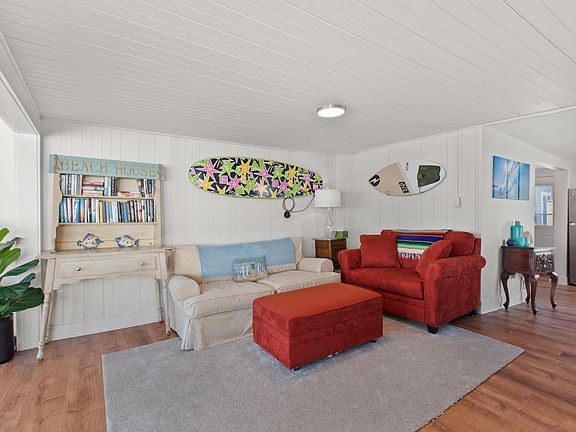 First floor has eat-in kitchen, 1/2 bath with stacked washer/dryer, open concept living room, and outdoor space on the sand with small deck. Second floor has full bath with stand up shower, master bedroom (queen bed) overlooking the waves, and 2 additional bedrooms (1 with full bed, the other with full over full bunk beds).