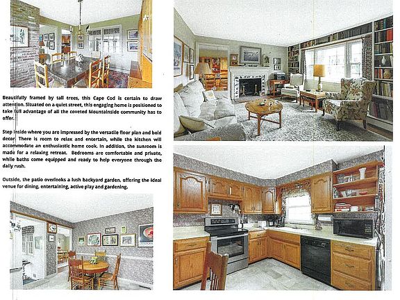 4 bedroom, 2 full bath Cape Cod home, on level corner lot in the heart of Mountainside; Close to schools and main roads and highway; Living room with fireplace. Formal Dining room, and Eat in kitchen. Heated Sun Room; 2 bedrooms and a full bath on first floor and 2 bedrooms and full bath on second floor plus attic space. Partially finished full basement. Great house, move in ready.