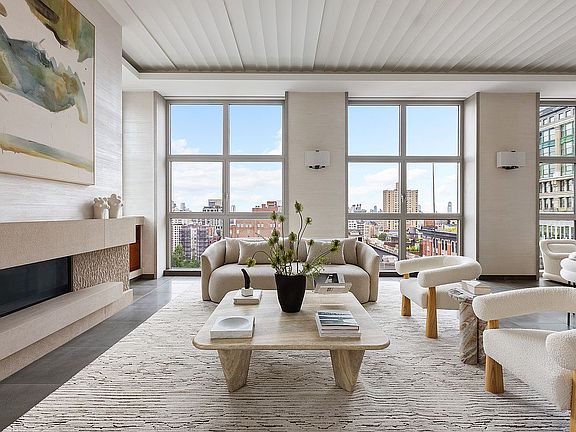 The dramatic great room features a gas fireplace with a limestone surround, a large dining area, and a dry bar, all complemented by a Crestron-controlled lighting and audio system. Floor-to-ceiling, museum-grade UV-protected windows frame sweeping views of Gramercy Park, the Chrysler Building, and the Empire State Building.