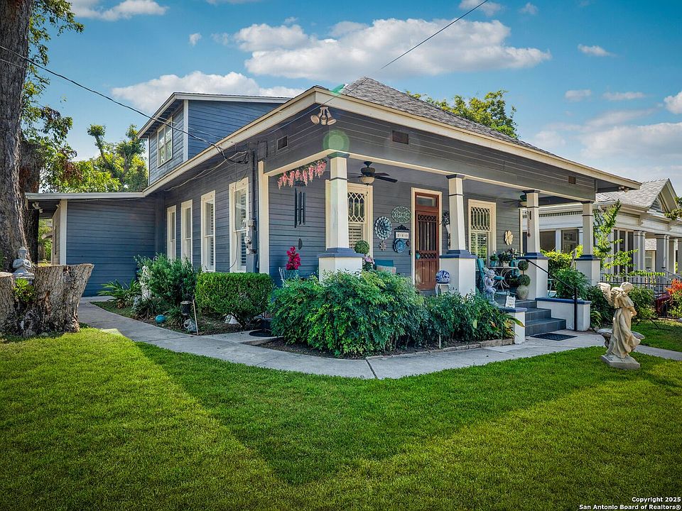 UrbanLiving Inside410 - Nestled in the heart of historic Westfort, 240 Post Ave is a beautiful cross between Folk Victorian charm and transitional vernacular architecture. On a rare double lot totaling .37 of an acre, this completely gated property with automatic entry gate offers privacy, character, and space. The inviting front porch sets the tone, welcoming you into a home filled with timeless details. Inside, soaring 11-foot ceilings, hardwood floors, and plantation shutters provide warmth and elegance. The formal dining room flows seamlessly into the gourmet kitchen, featuring stainless steel appliances, gas cooking, soapstone countertops, and charming herb windows. The kitchen opens to a comfortable den anchored by a cozy fireplace. The spacious master suite boasts a built-in glass-front display cabinet, an updated bath with a walk-in shower, double vanity, and a generous walk-in closet. The 2nd bedroom plus a flex space that can be office, hobby or 4th bedroom are located downstairs, while upstairs you'll find a private third bedroom with its own bath. Outdoors, a two-car carport and a large storage room offer functionality with the latter presenting an excellent opportunity for conversion into a casita or studio. With its blend of architectural details, thoughtful updates, and a rare oversized lot, 240 Post Ave captures the spirit of historic San Antonio living while offering all the conveniences of today. Close to The Pearl, Museum Reach, Botanical Gardens, Zoo, Fort Sam, Brackenridge Park and Downtown.