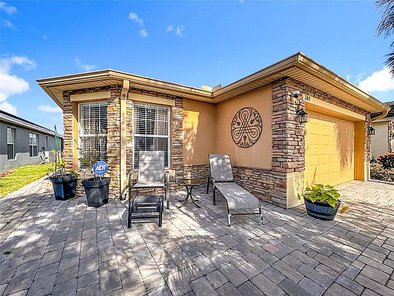Open concept FURNISHED stone front Bordeaux model has vaulted ceilings with a sweeping waterfront view which gives the ambiance you are looking for in a Florida home. The Great Room & adjoining Dining Room allow you to entertain on the over 500 Sq.Ft. covered & open screened lanai. A Primary Suite with views to the water is a king-sized room with adjoining bathroom that has a shower with two seats, dual closets, large vanity & private access to lanai. The second bedroom & adjacent bath with shower & tub is perfect for guests. The den is a multipurpose room that can function as an extra bedroom, office or media room. This home also has a custom front 15.5 x 13.5 stone patio making entertaining anywhere in this home easy & fun! The large kitchen & dinette area is perfect for 2 chefs & has stainless steel appliances with plenty of counter space. An inside laundry with access to the garage that fits a full-sized car & golf cart as well as a workshop features epoxy flooring, pulldown stairs & beverage refrigerator. The home features a 2023 HVAC, 2015 HWH & 2016 Roof. Solivita is an active adult 55+ community located in Poinciana, Florida. It is approximately 50 minutes from Disney World & Orlando International Airport. Solivita has a total of 5,470 homes. Enjoy your active years in this paradise. Solivita's amenities include a softball diamond & field - 36 holes of championship golf that can be played by joining the Stonegate Golf Club or paying as you go - 2 State of the Art Amenity Centers with updated exercise equipment, yoga studio & meeting rooms - 3 restaurants - 14 heated pools - 17 pickleball courts - 9 tennis courts - 4 bocce ball courts - 4 shuffleboard courts - 3 horseshoe pits - a billiards room - miles of bike paths - 2 dog parks (Small & Large Dogs) - Corn Hole - Tot Lot playground – community garden - over 250 resident clubs. The HOA: - maintains the LANDSCAPING & IRRIGATION systems in the common areas as well as at individual homesites - maintains the roads throughout the community - PROVIDES SECURITY with gate guards and mobile patrols including the Polk County Sheriff - allows AUTOMATED GATE ACCESS for residents via license plate readers - provides residents with Fiber Optic Internet & TV service. Poinciana Lakes Plaza is a new shopping center directly across from the Solivita Main Gate. It features Sprouts Grocery, TJ MAXX, Ross, Burlington, Rack Room Shoes, 5 Below, Ulta, Outback, First Watch, 5 Guys, Panda Express, Bojangles, Jersey Mike's Subs, 5 Guys, Papa John's Pizza, Burrito Bar, Cold Stone Creamery, Urgent Care, Dentist, Hand & Stone Massage, America's Best Eyeglasses, Crunch Fitness, Hair Cuttery, Petco, TD Bank, Verizon Mobile, PLUS MORE TO COME. A 2022 STAR Sirius 5 4-seater GOLF CART with a lithium battery is available for sale under separate contract. This home offers move in ready convenience, just pack your clothes & come to Solivita!