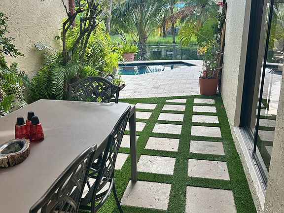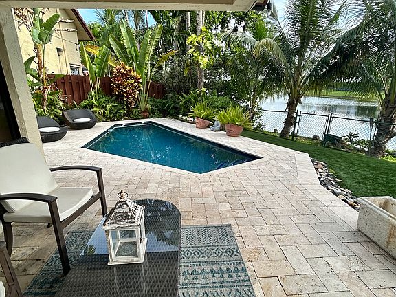 Split 2/2 single-family waterfront home with garage, laundry room, and pool. Beautiful backyard with lush landscaping, palm trees, travertine, turf, and grass areas. Enjoy stunning water views from the kitchen, living room, and master bedroom.