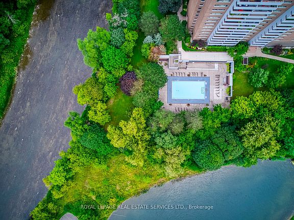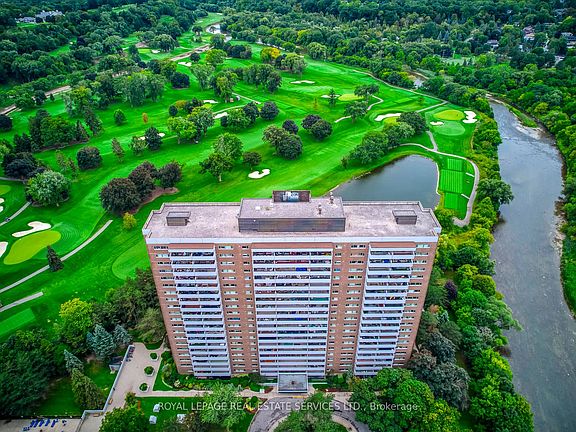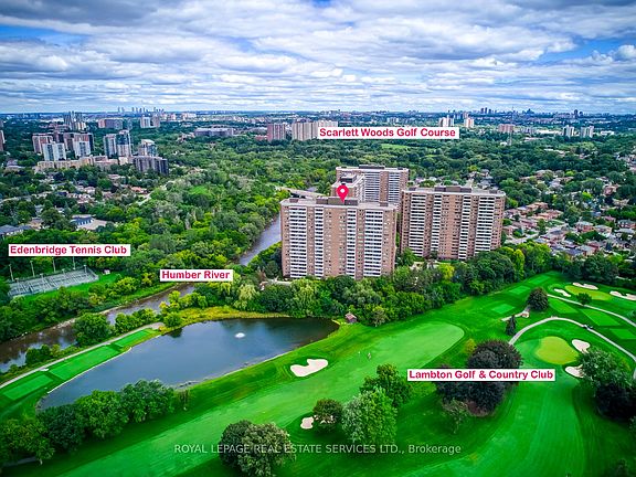 The Lambton Square condominium community consists of four distinct towers, each forming a separate condo corporation with its own dedicated recreation facilities. This condo is ideally situated at 240 Scarlett Rd and offers exceptional access to a wide range of amenities. Public transit is steps away, with multiple bus routes along Scarlett and easy connections to Runnymede Station on the Bloor subway line. Daily conveniences are nearby: grocery stores, European bakeries, and local shops. For nature lovers, the building backs onto the Humber River trails and is a short stroll to James Gardens-perfect for walking, cycling, or simply enjoying the outdoors. Golf enthusiasts will appreciate having the prestigious Lambton Golf & Country Club next door. Unit 405 offers exceptional value for those seeking spacious & functional living. The unit offers a family-sized kitchen with a cozy breakfast nook, a proper dining room, and a generous sunken living room with an electric fireplace. When you step out onto the oversized private balcony, the first thing you notice is the Humber River flowing just right there. Surrounded by mature trees, it feels less like a condo and more like your own private home. Beautiful flooring runs through the main areas, with wood parquet in the bedrooms. The primary bedroom includes a large closet and a 4-piece ensuite. The second bedroom works beautifully as a guest room or home office. Both bathrooms are 4-piece, featuring built-in cabinetry, a shower enclosure, and a soaker tub. An ensuite laundry room with additional storage completes this well-designed space. The building offers top-tier amenities: outdoor pool, fitness centre, sauna, party/meeting rooms, car wash bay & bike storage. Whether you're looking to downsize or upsize into space that finally feels like home, you may want to consider this property. Relax by the pool, stroll or cycle the trails, or hit the gym -- lifestyle, comfort, and value all in one place.