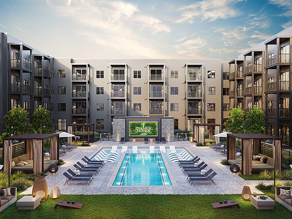 - Exterior features: 10 ft ceilings available on ground floor units, Barbecue, Bicycle storage, Business Center, Deisgner tile backsplash in kitchens, Designated vehicle charging stations, Dual vanity in select apartments, Frameless shower door enclosures, LATCH Bluetooth smart entry, Open concept floorplans, Package Receiving, Pet Park, Private patios & balconies, Quartz countertops in kitchens & bathrooms, Screen on the green movie night events, Secure detached garages available